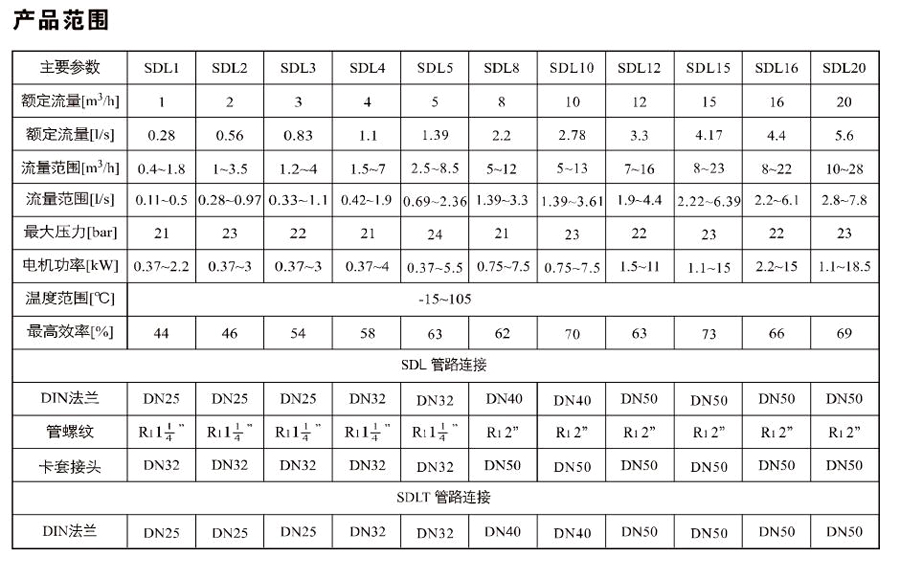 SDL8/SDLT8是一種多功能產品,可以輸送從自來水到工業(yè)液體的各種不同介質,適用于不同溫度、流量和壓力范圍。