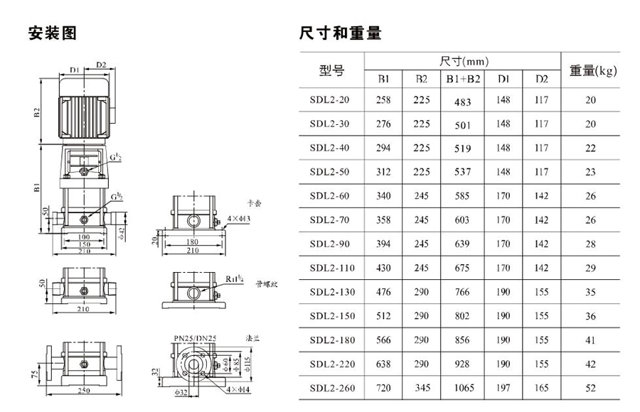 SDL2/SDLT2為配用標準電機的非自吸立式多級離心泵,電機軸和泵軸用聯(lián)軸器直接聯(lián)接,把拉桿用螺母將外筒,過流部件固定在支架和進出水體之間,泵進出水口在泵底部的同一直線上。泵可根據(jù)需要配置智能保護器,對泵的干轉(zhuǎn)、缺相、過載等進行有效的保護。