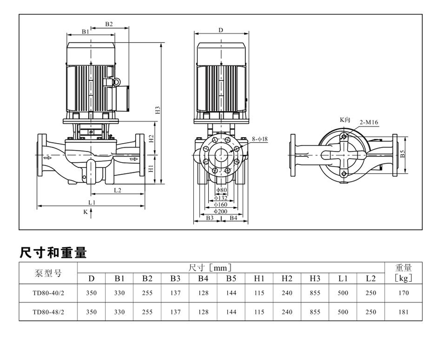 TD80系列單級管道離心泵,配有標準電 機和機械密封。此類產品的結構與相近類型產品相比,更不易受到泵送液體中雜質的影響。產品設計為頂部可拉出的拆裝形式,其可 以在不影響管路系統的情況下對泵進行維修。所有泵采用創新式便拆式機械密封,更好機械密封無需拆卸電機。